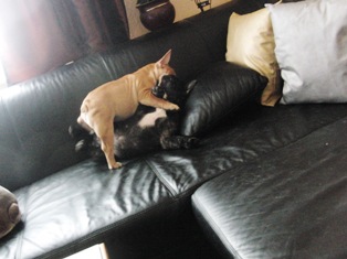 Gerne schmusen sie auch mal mit Mama und dann werden Küsschen getauscht und Bonny leckt und schleckt. Bonny klaut ihren Welpen auch gern das Spielzeug und kaut es dann kaputt. Da kann sie einfach nicht wieder stehen. Es ist ja auch zu verführerisch.