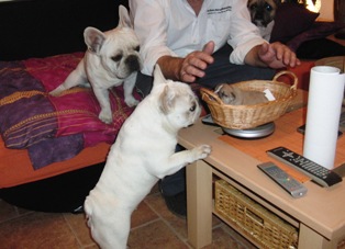 Und so sieht es am Abend aus wenn die Welpen gewogen werden. Matzi steht am Tisch und beobachtet die Kleinen auf der Wage und Bobo und Fini sitzen auf der Couch und hoffen schnell mal ein Leckerchen über einen Welpen zu erhaschen. Bonny ist jetzt auch schon entspannter und die Anderen dürfen auch schon mal an die Welpen wenn wir dabei sind.