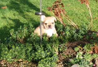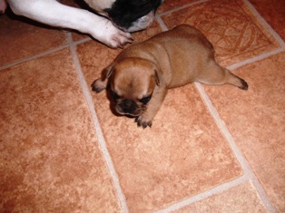 Dodge schläft hier ganz gemütlich und träumt sicher schon vom nächsten Fresschen. Douglas und Dodge sind nicht so sehr vom Futter angetan. Sie ernähren sich lieber weiter mit Muttermilch. Ist für die Beiden bestimmt zu anstrengend, man muss sich ja beim Fressen bewegen. Aber wenn Mama ins Welpenställchen kommt, sind sie ganz schnell an der "Milchbar" und schubsen die anderen ganz schnell weg. Und dann hört man es nur noch schmatzen. Es sind kleine Feinschmecker.