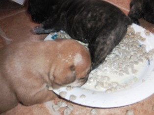 Hier heute noch einmal ein paar Fotos von der großen Schlacht um den Fressnapf. Man beachte Dodge wie breit er sich machen kann um genügend Platz am und im Napf zu bekommen. Aber sie fressen jetzt schon sehr schön selbstständig und man braucht sie nicht mehr zum Fressnapf setzen. Nur ab und zu muss man die gefräßigsten wieder aus dem Napf nehmen und wieder draußen hinsetzen. Douglas hat heute die 1.500 g erreicht und man hat schon richtig etwas in der Hand wenn man ihn hochnimmt.