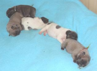 Heute ist die kleine Bande nun schon wieder 2 Wochen alt und sie entwickeln sich prächtig. Alle nehmen gut zu, einer mehr und der andere weniger. Aber sie sind alle "bully"mobil.