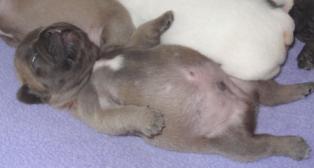 Und so sieht ein kleiner verfressener Welpe aus, der nicht genug bekommt, so dass die Milch aus dem Näschen wieder herausläuft. Die Welpen sind sehr gute Fresser und alle nehmen gleichmäßig zu.