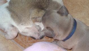 Nacheinander hat jeder mal das Spielzeug im Maul gehabt und hat darauf herum gekaut. Aber viel schöner findet unsere Bande das "Bullywrestling".