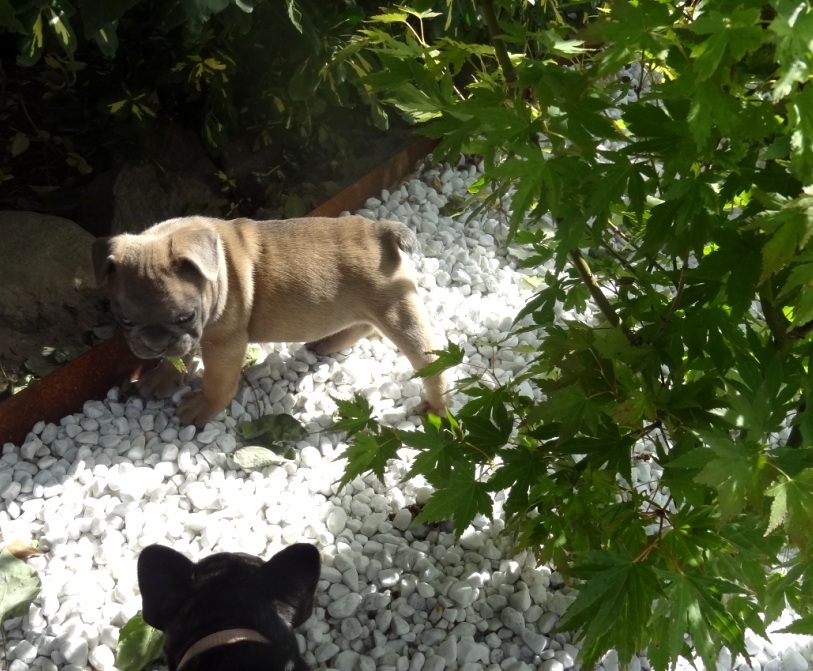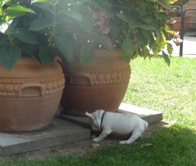 Im Garten ist ihre liebste Tobefläche dort wo die Blumenkübel stehen. Mn kann sich so schön verstecken und durch die Lücken jagen.