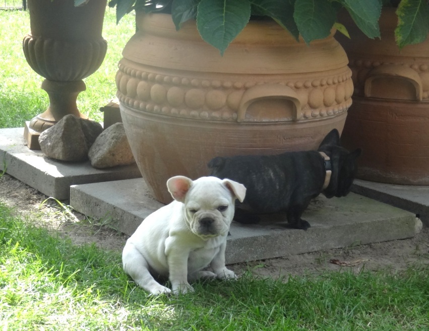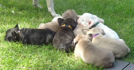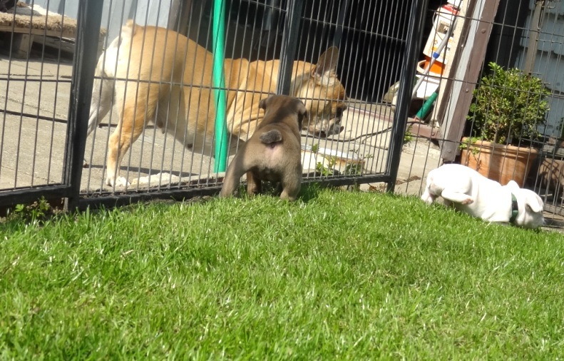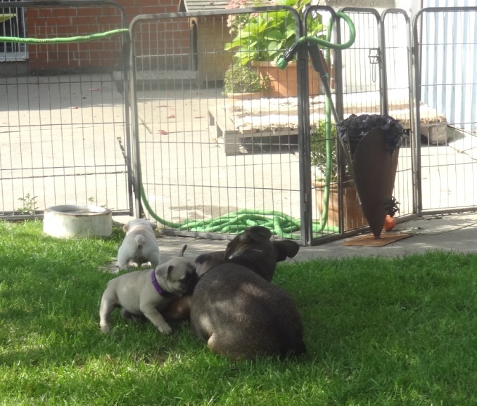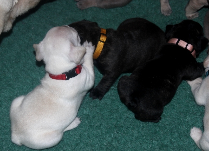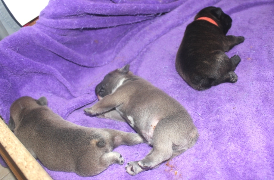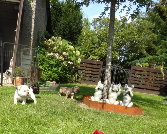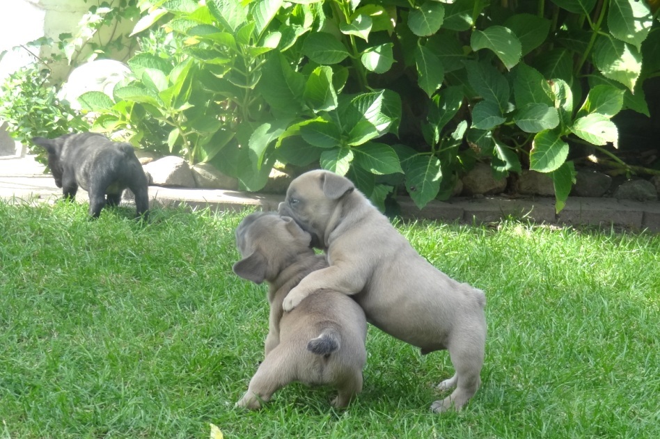 Blue und Buddy machen auch keine Anstalten, aber sie sind ja auch noch ein paar Tage jünger. Mit stehenden Ohren sehen sie gleich viel mehr wie Bullys aus.