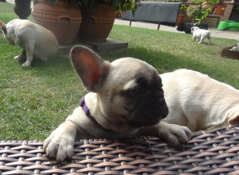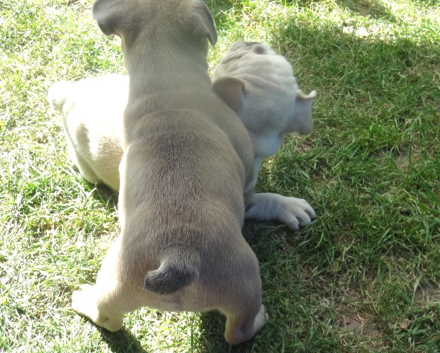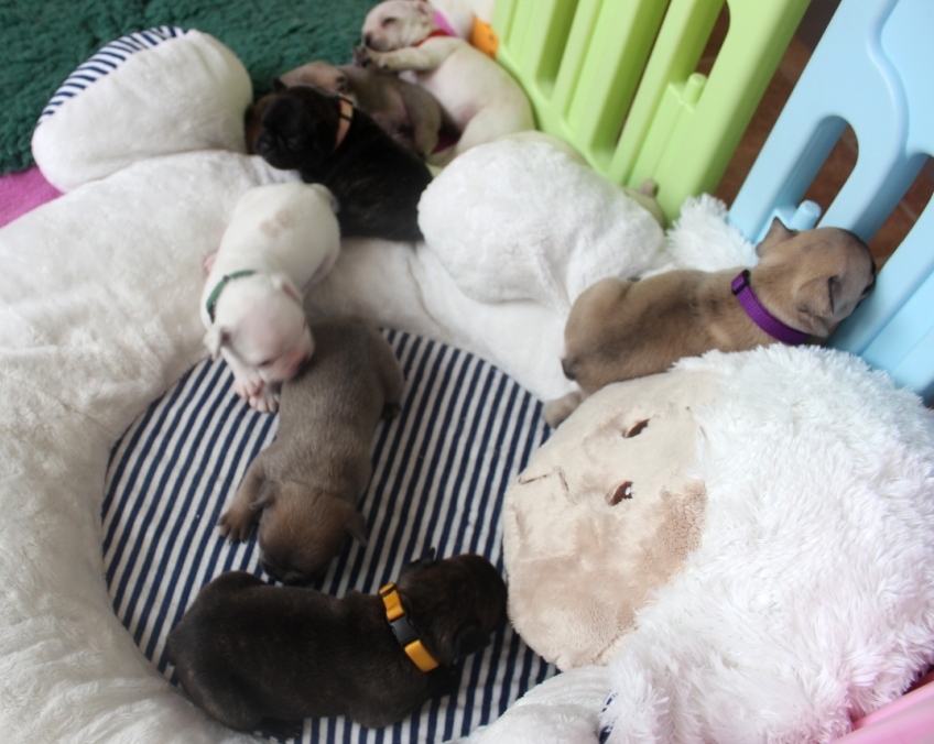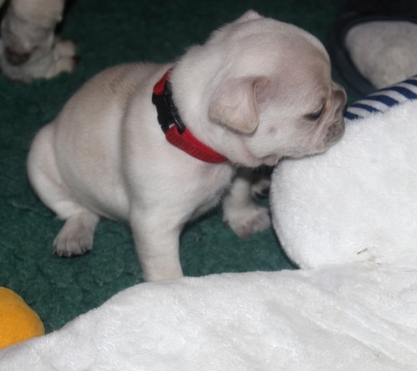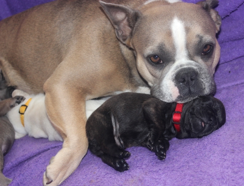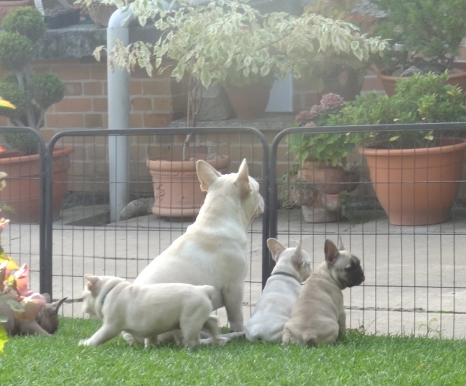 Blue und Buddy machen auch keine Anstalten, aber sie sind ja auch noch ein paar Tage jünger. Mit stehenden Ohren sehen sie gleich viel mehr wie Bullys aus.