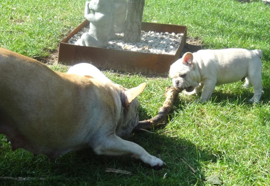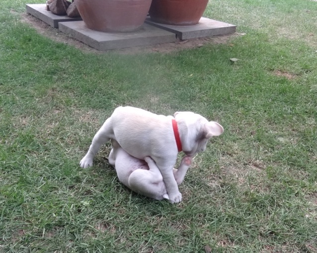 Und sonst wird in der Zeit wo sie nicht chillen gekämpft und getobt. Manchmal knurren sie sich schon richtig an und auch kleine Bellerchen sind zu hören.