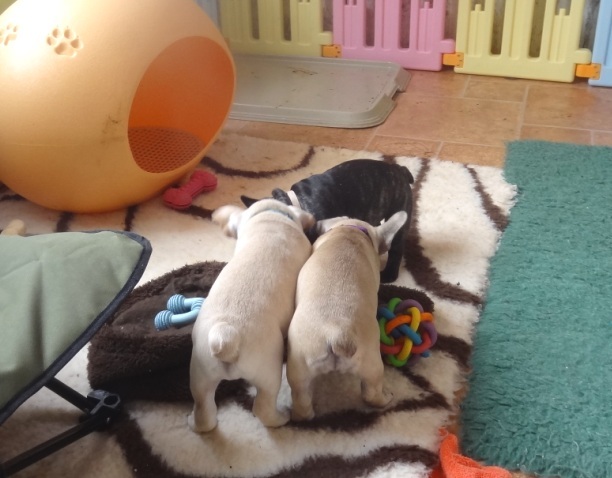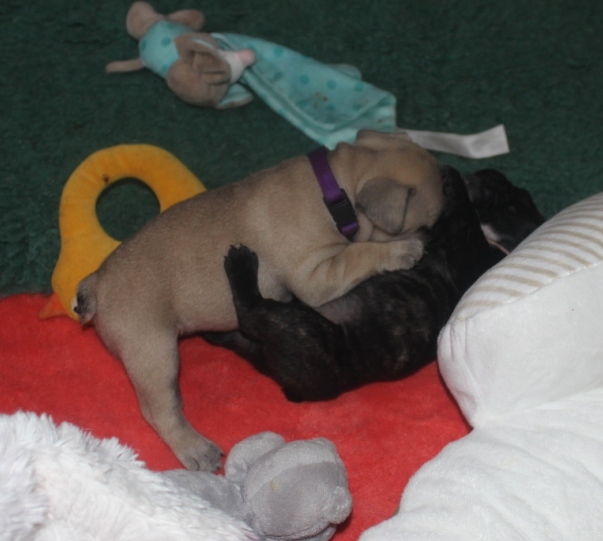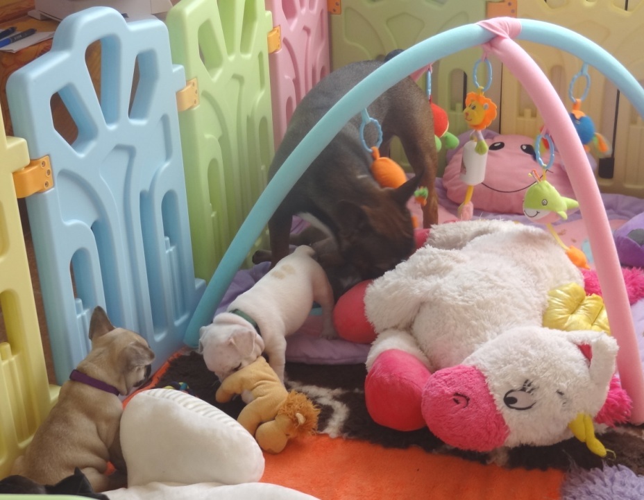 Da können dann meine kleinen Faultiere toben und kämpfen. Es sind eigentlich so ruhige Welpen. Man hört sie fast nicht. Außer nachts da fangen sie an zu spielen und das Spielzeug macht dann Krach.