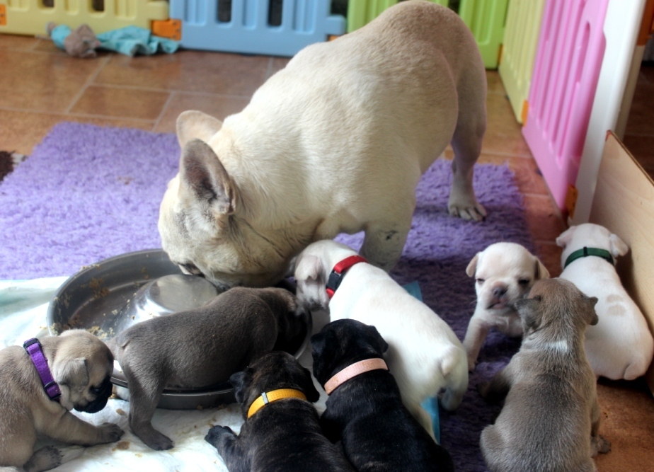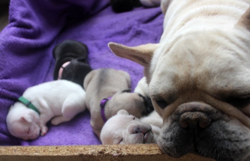 Unsere anfänglichen Ängste waren ganz unbegründet. Die beiden Mamas teilen sich jetzt die Pflege und Fütterung der Welpen. Am Tage sind sie immer im Wechsel bei den Kleinen, aber nachts klappt es ganz gut.