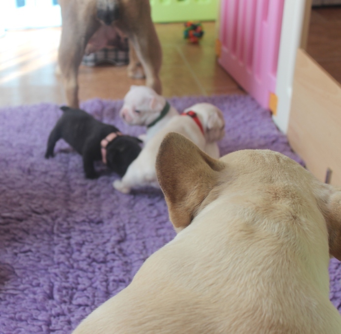 Unser Bobi hat nun endlich seine Welpen wieder gefunden. Er wollte sonst immer in das andere Zimmer und war dann enttäuscht, dass da keiner war.